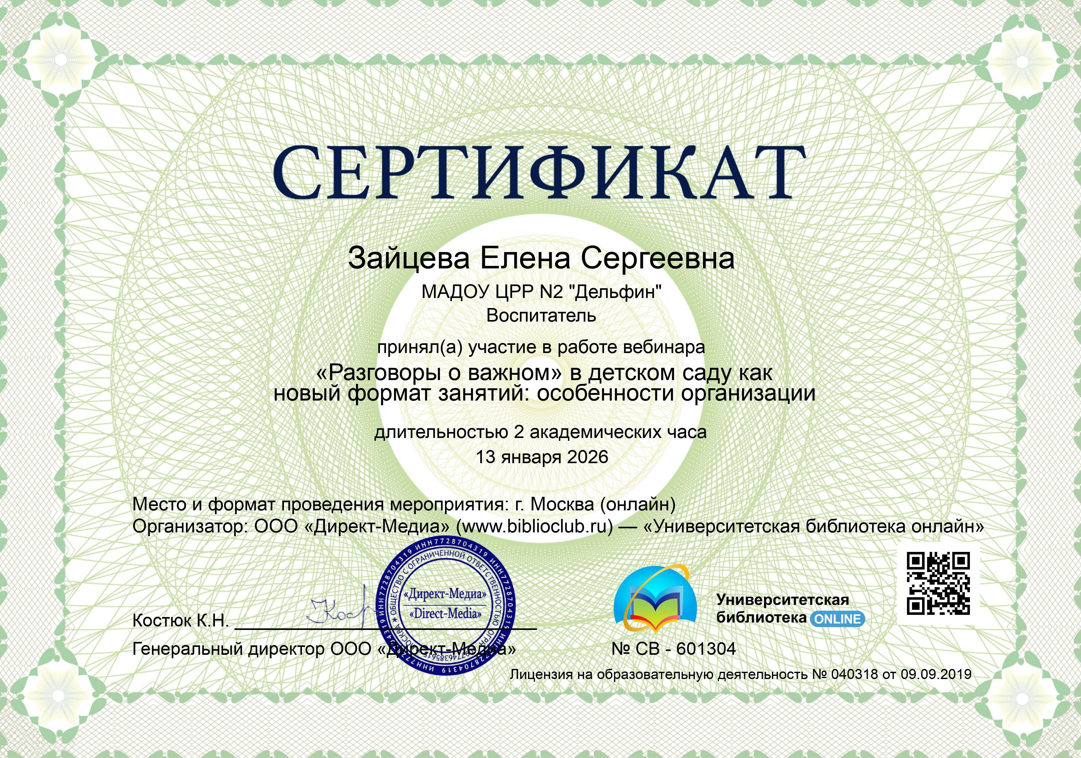 Сертификат за участие в вебинаре "Разговоры о важном" в детском саду как новый формат занятий: особенности организации" (13.01.2026г)