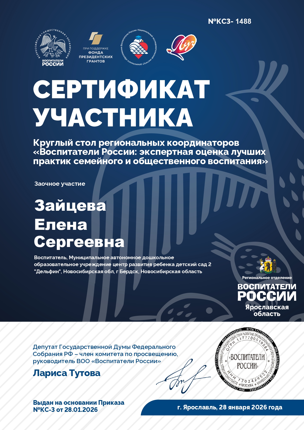 Сертификат участника "Круглый стол региональных координаторов "Воспитатели России: экспертная оценка лучших практик семейного и общественного воспитания" (28.01.2026г)