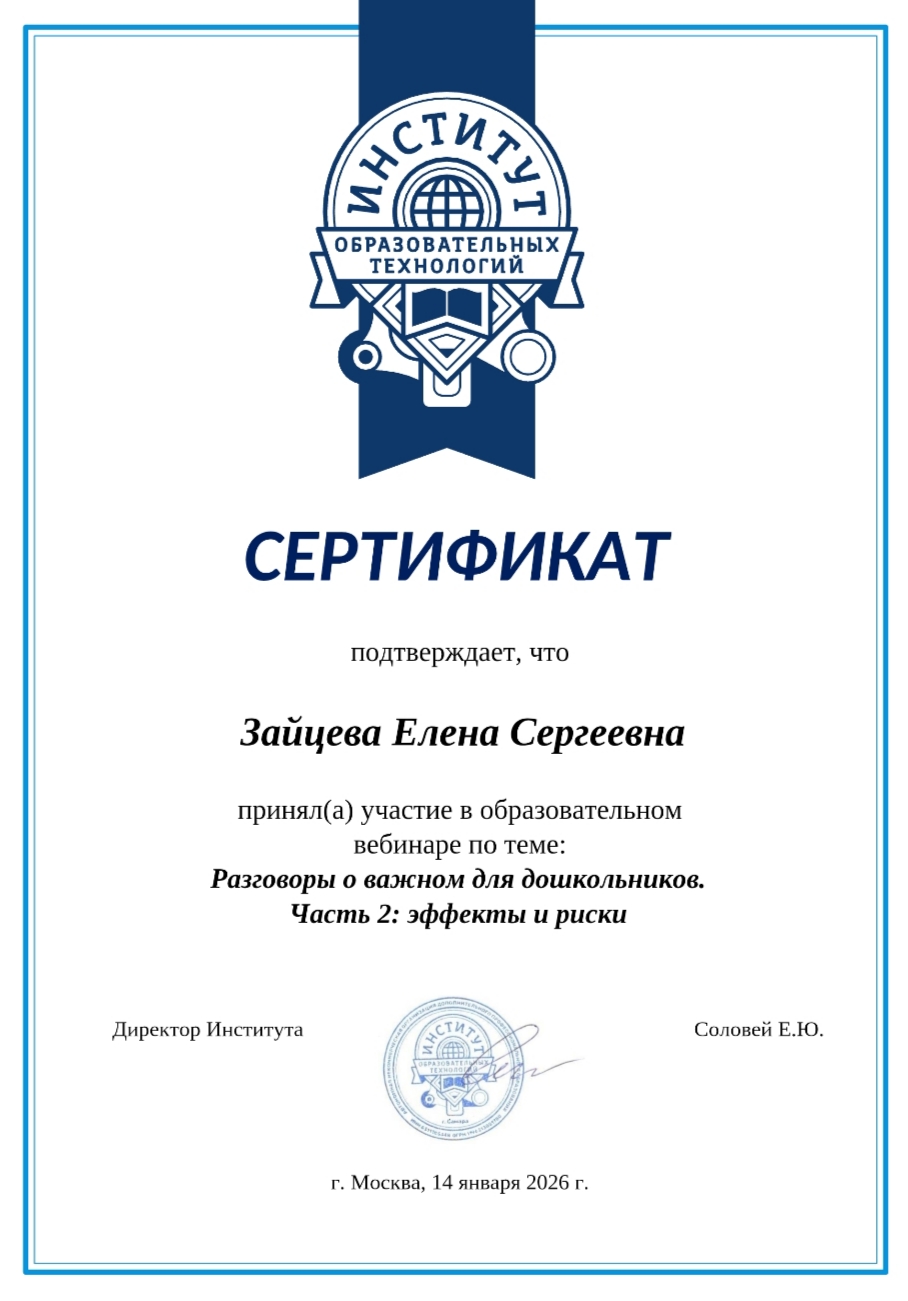 Сертификат за участие образовательном вебинаре по теме: "Разговоры о важном для дошкольников. Часть 2: эффекты и риски" (14.01.2026г)