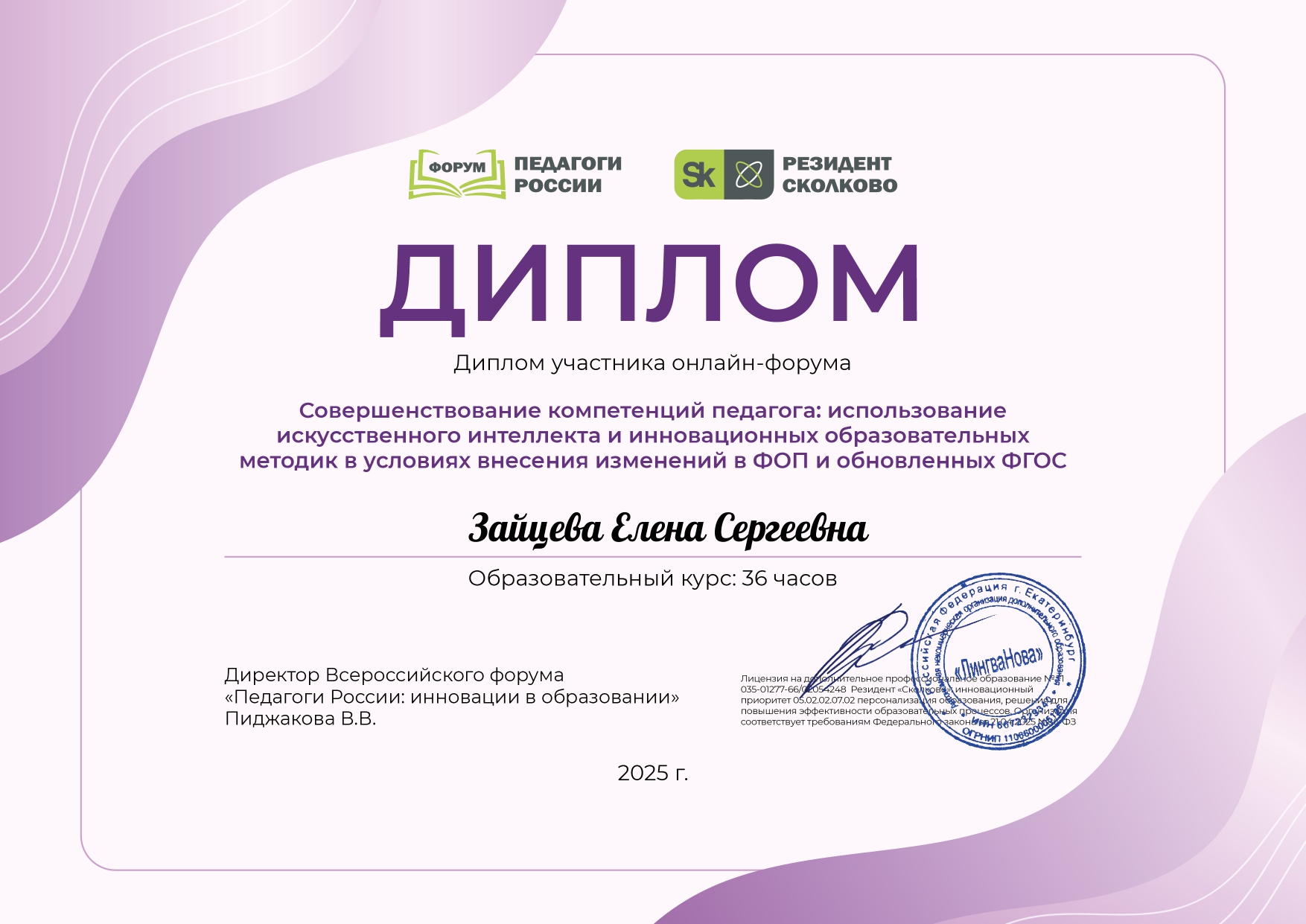 Диплом участника онлайн-форума "Совершенствование компетенций педагога: использование искусственного интеллекта и инновационных образовательных методик в условиях внесения изменений в ФОП и обновлённых ФГОС" (15.11.2025г)