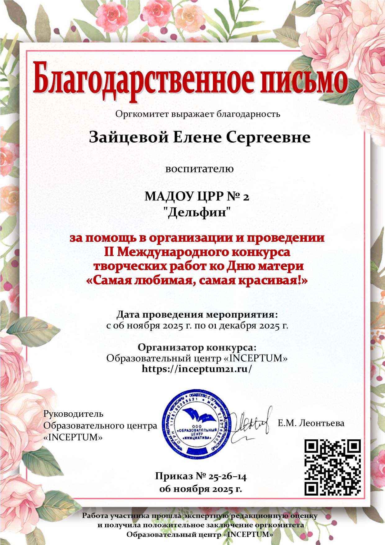 Благодарность за помощь в организации и проведении II Международного конкурса творческих работ ко Дню матери "Самая любимая, самая красивая!" (06.11.2025г)