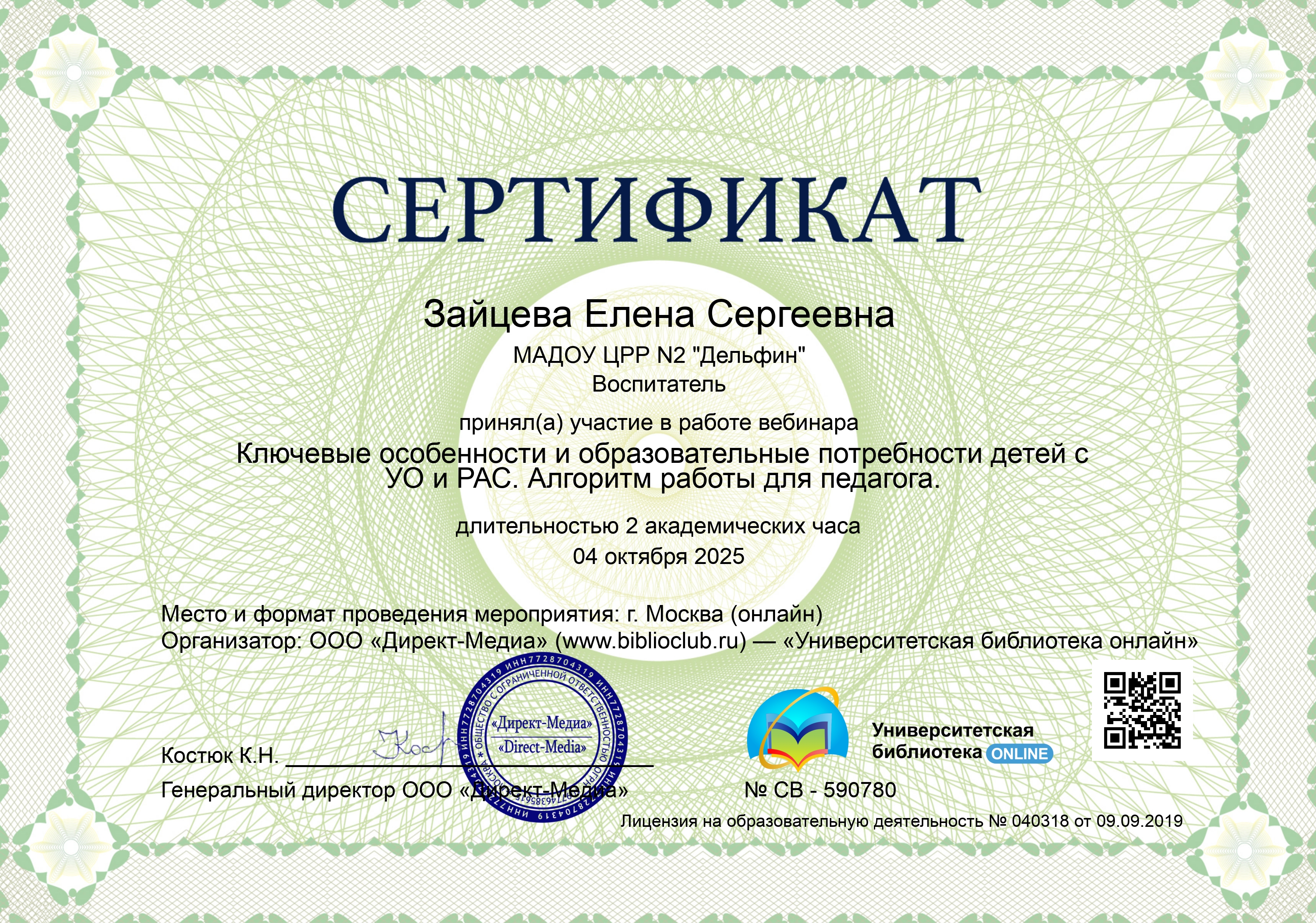 Сертификат за участие в вебинаре "Ключевые особенности и образовательные потребности детей с УО и РАС. Алгоритм работы для педагога (04.10.2025г)