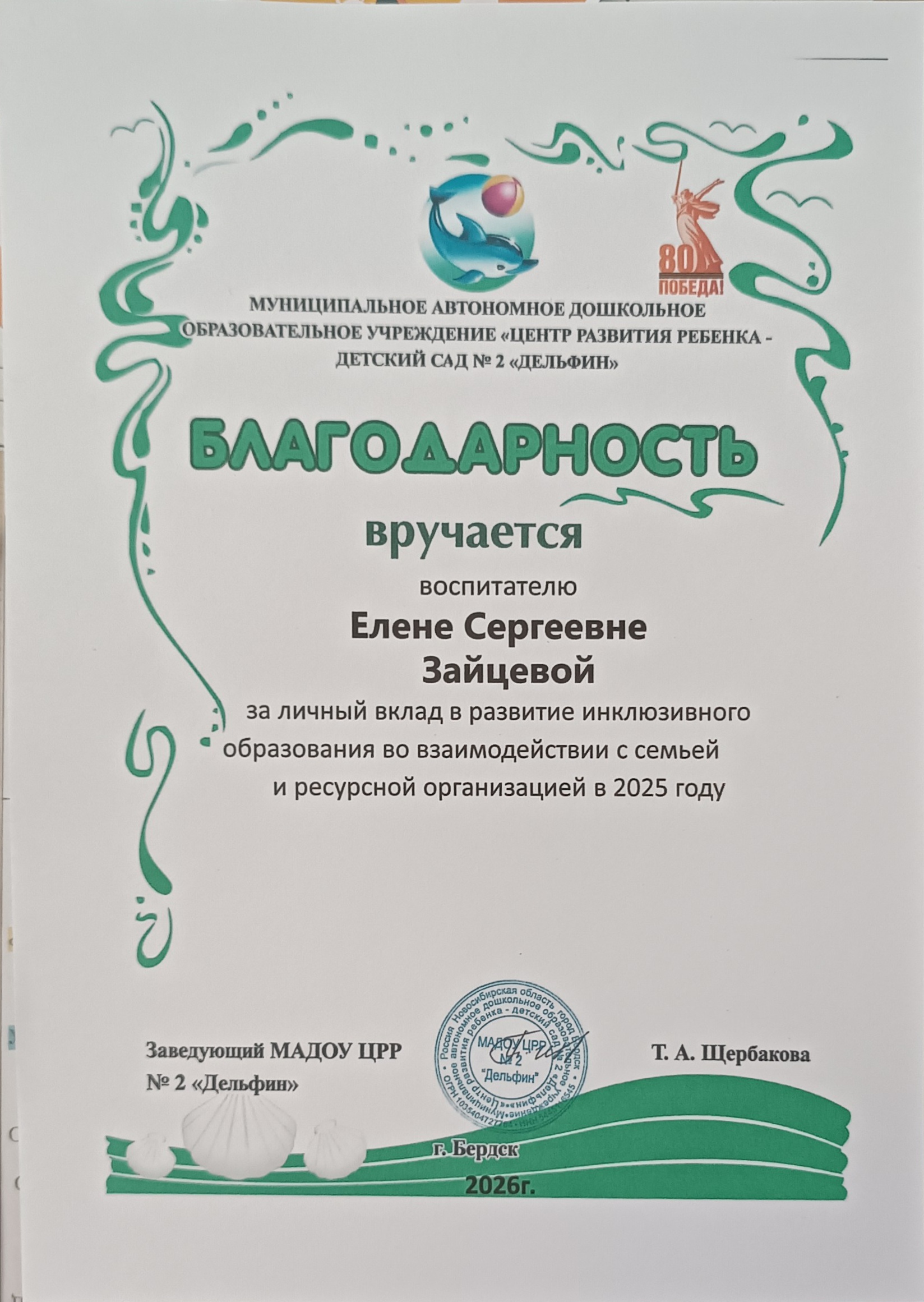 Благодарность за личный вклад в развитие инклюзивного образования во взаимодействии с семьей и ресурсной организацией в 2025 году